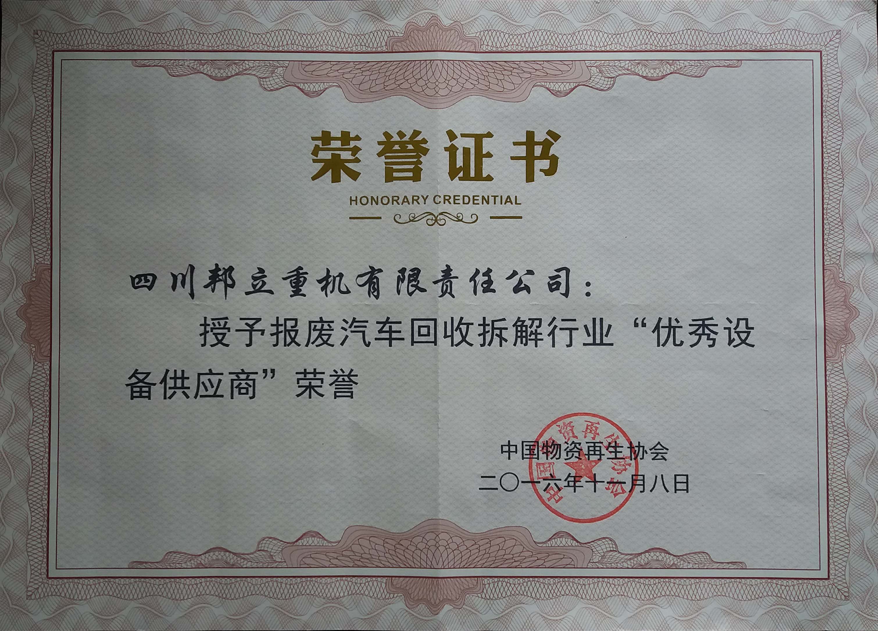 四川邦立重機有限責任公司,經歷多年的不懈努力,其生產制造的系列報廢汽車拆解機設備,得到了各行業(yè)用戶的廣泛認可和支持。在剛剛召開的2016年中國報廢汽車行業(yè)年會上,邦立重機有限責任公司獲得了中國物資再生協(xié)會授予的報廢汽車回收拆解行業(yè)“優(yōu)質設備供應商”的榮譽。